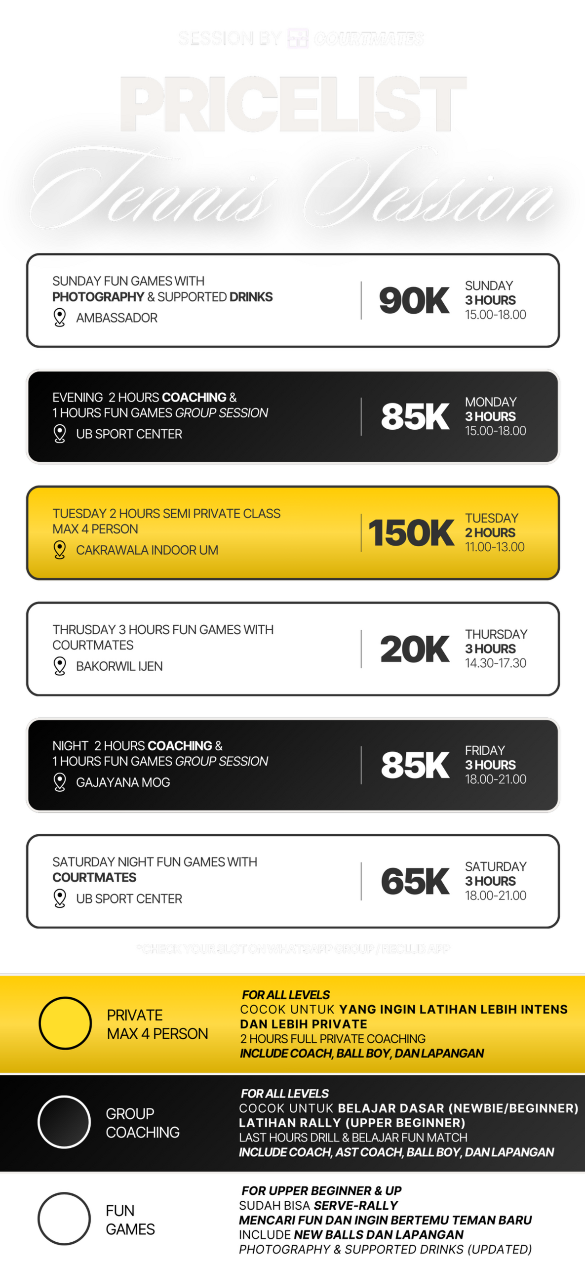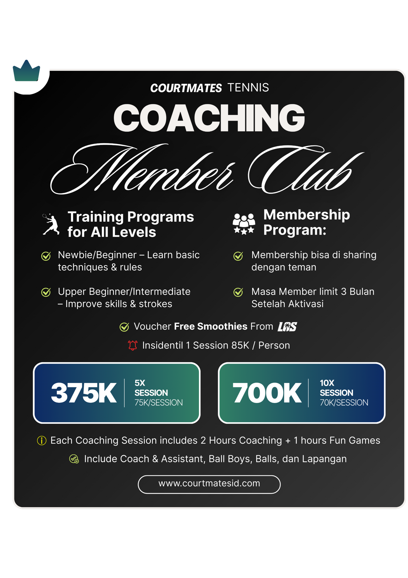 Courtmates dibuat karena kami ingin merangkul semua orang yang punya minat di tenis. Mau kamu baru pertama kali pegang raket atau sudah lama main, semua bisa gabung dan seru-seruan bareng. Di sini kamu juga bisa kenalan dan networking sama banyak orang baru.Kami percaya tenis itu bukan cuma soal menang, tapi juga tentang berkembang, saling mendukung, dan menikmati permainan.Di Courtmates kamu bisa ikut group coaching biar belajar bareng, private coaching kalau mau fokus sama kebutuhan kamu, dan juga fun games buat main santai sambil ketawa-ketawa.Buat kami, lapangan tenis adalah tempat untuk belajar, menjalin koneksi, dan pastinya bersenang-senang.